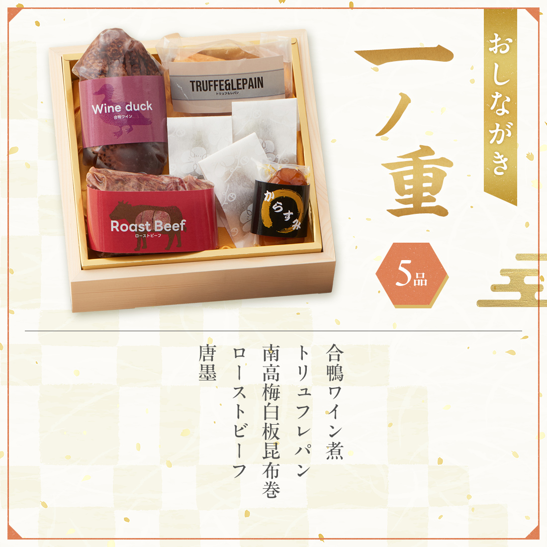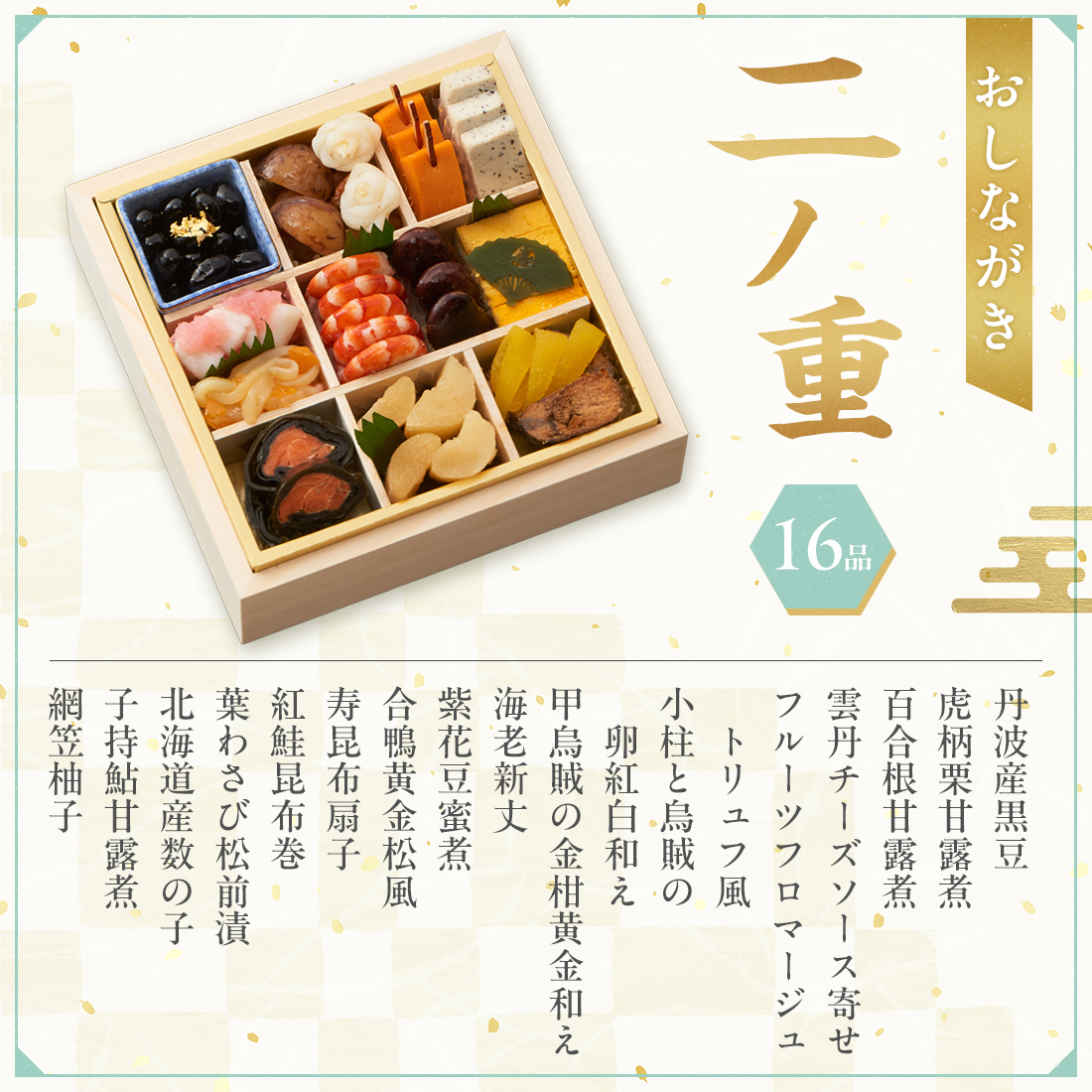 丹波産黒豆、虎柄栗甘露煮、百合根甘露煮、雲丹チーズソース寄せ、フルーツフロマージュトリュフ風、小柱と烏賊の卵紅白和え、甲烏賊の金柑黄金和え、海老新丈、紫花豆蜜煮、合鴨黄金松風、寿昆布扇子、紅鮭昆布巻、葉わさび松前漬、北海道産数の子、子持鮎甘露煮、網笠柚子