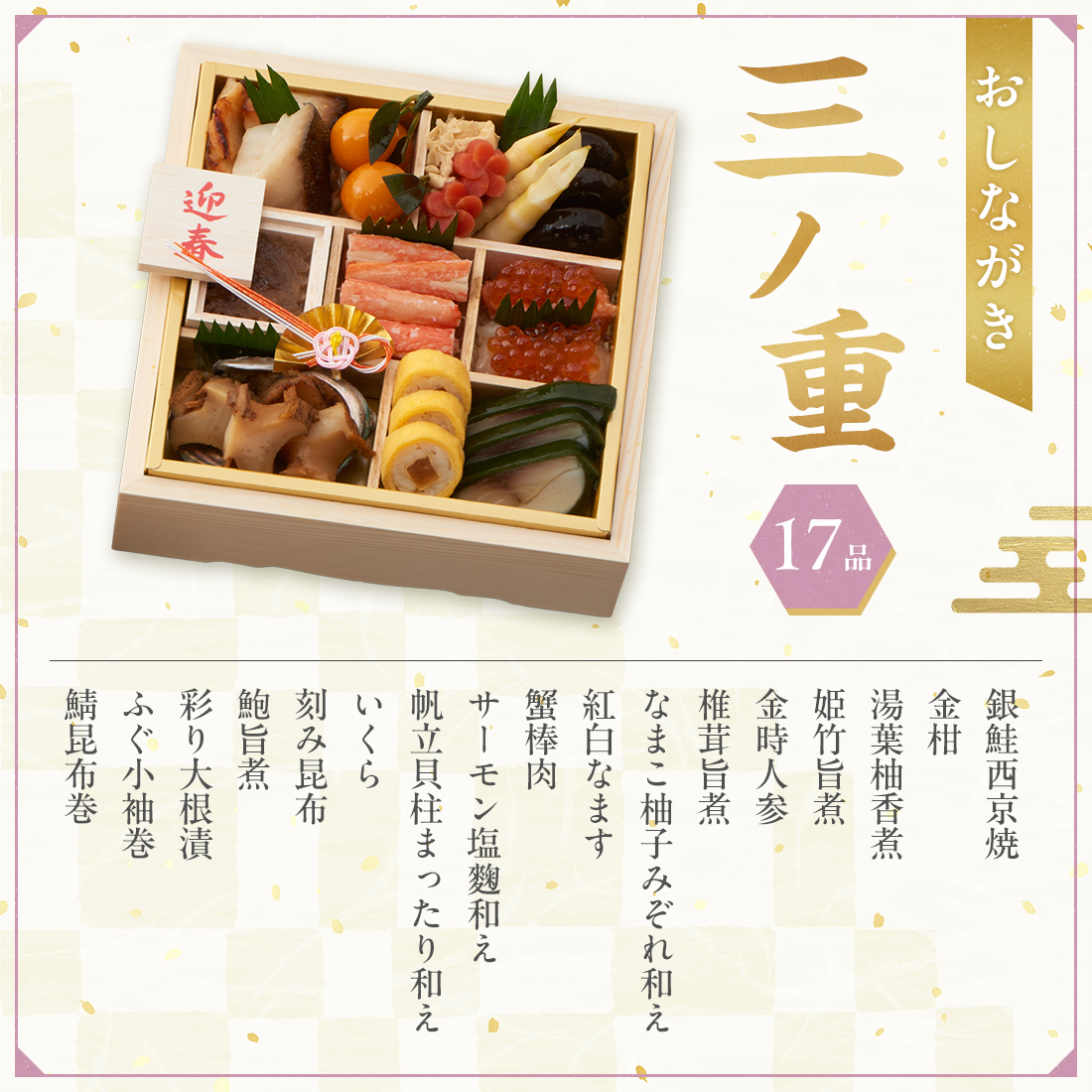 銀鮭西京焼、金柑、湯葉柚香煮、姫竹旨煮、金時人参、椎茸旨煮、なまこ柚子みぞれ和え、紅白なます、蟹棒肉、サーモン塩麹和え、帆立貝柱まったり和え、いくら、刻み昆布、鮑旨煮、彩り大根漬、ふぐ小袖巻、鯖昆布巻