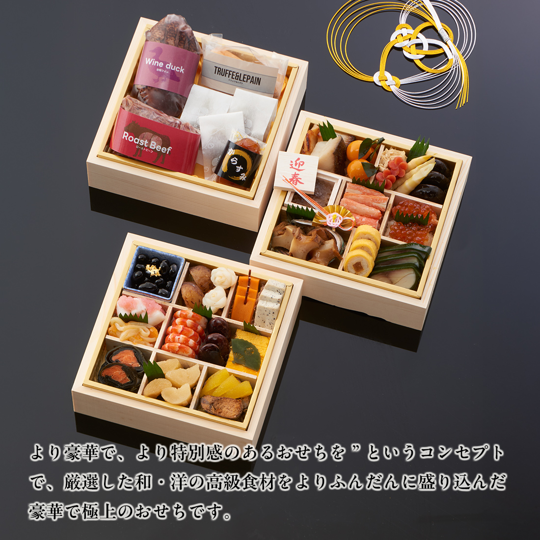 “より豪華で、より特別感のあるおせちを”というコンセプトで、厳選した和・洋の高級食材をよりふんだんに盛り込んだ豪華で極上のおせちです。