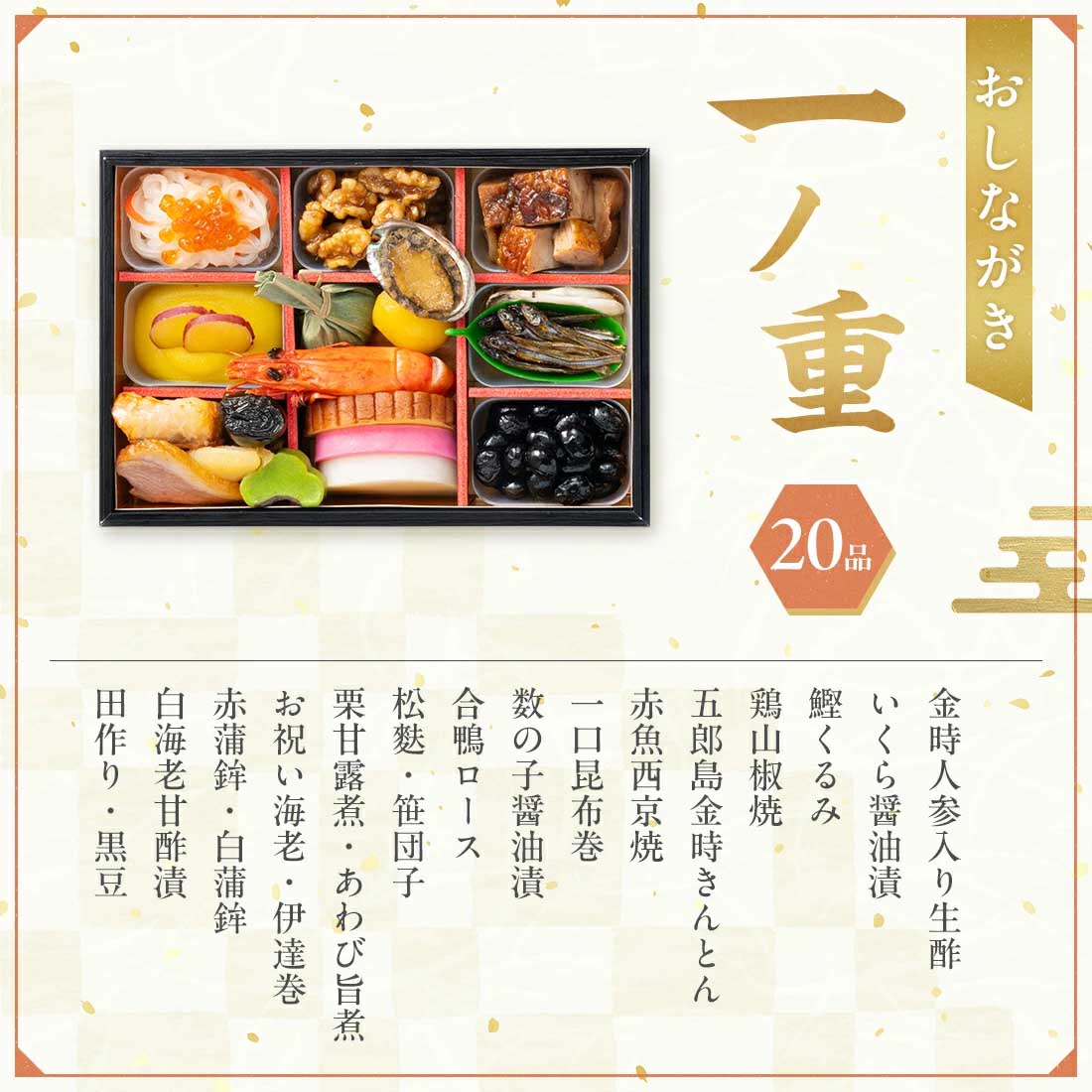 金時人参入り生酢30g、いくら醤油漬3g、鰹くるみ25g、鶏山椒焼40g、五郎島金時きんとん1個、赤魚西京焼1切、一口昆布巻1個、数の子醤油漬1切、合鴨ロース1切、松麩1個、笹団子1個、栗甘露煮1個、あわび旨煮1個、お祝い海老1尾、伊達巻1切、赤蒲鉾1切、白蒲鉾1切、白海老甘酢漬10g、田作り6g、黒豆40g