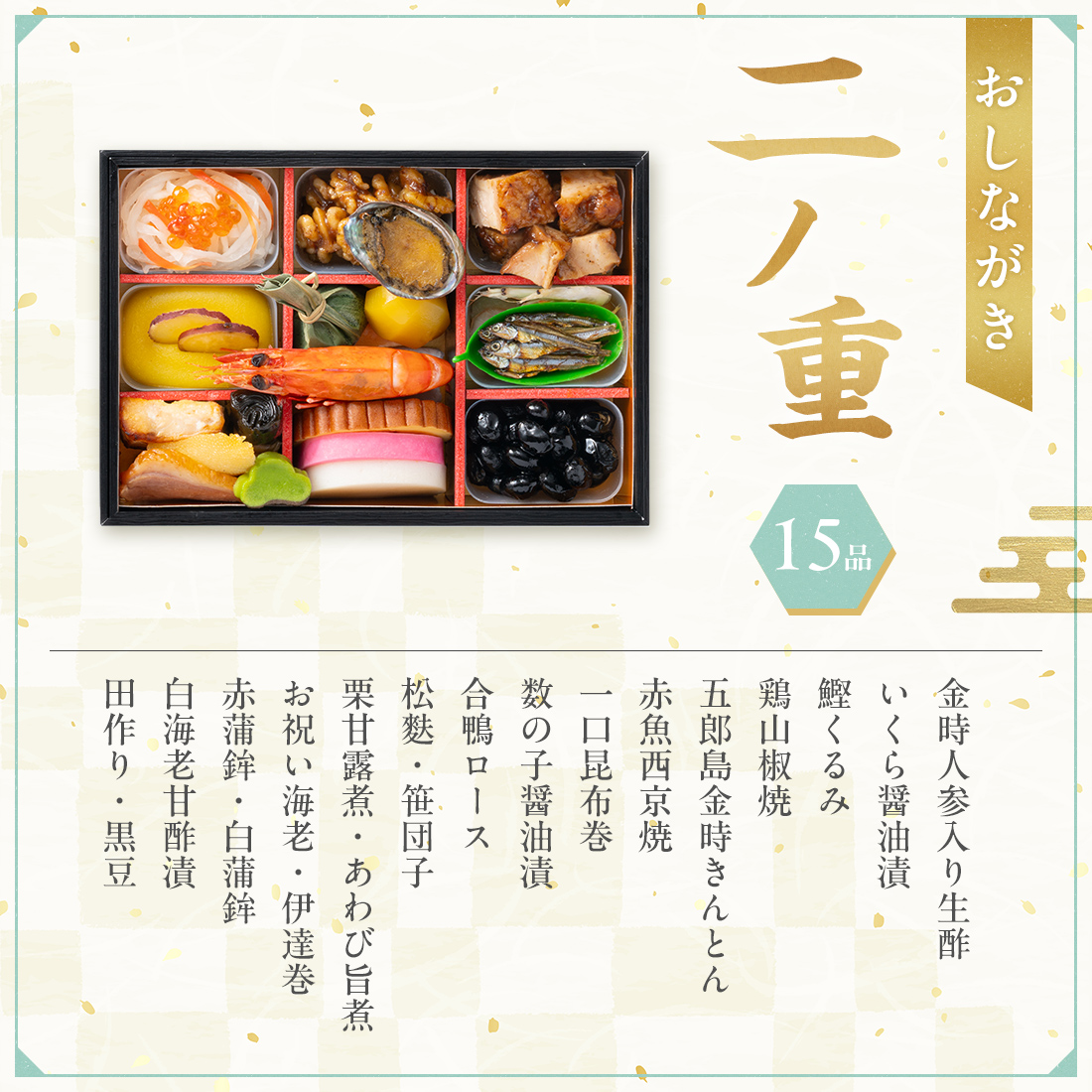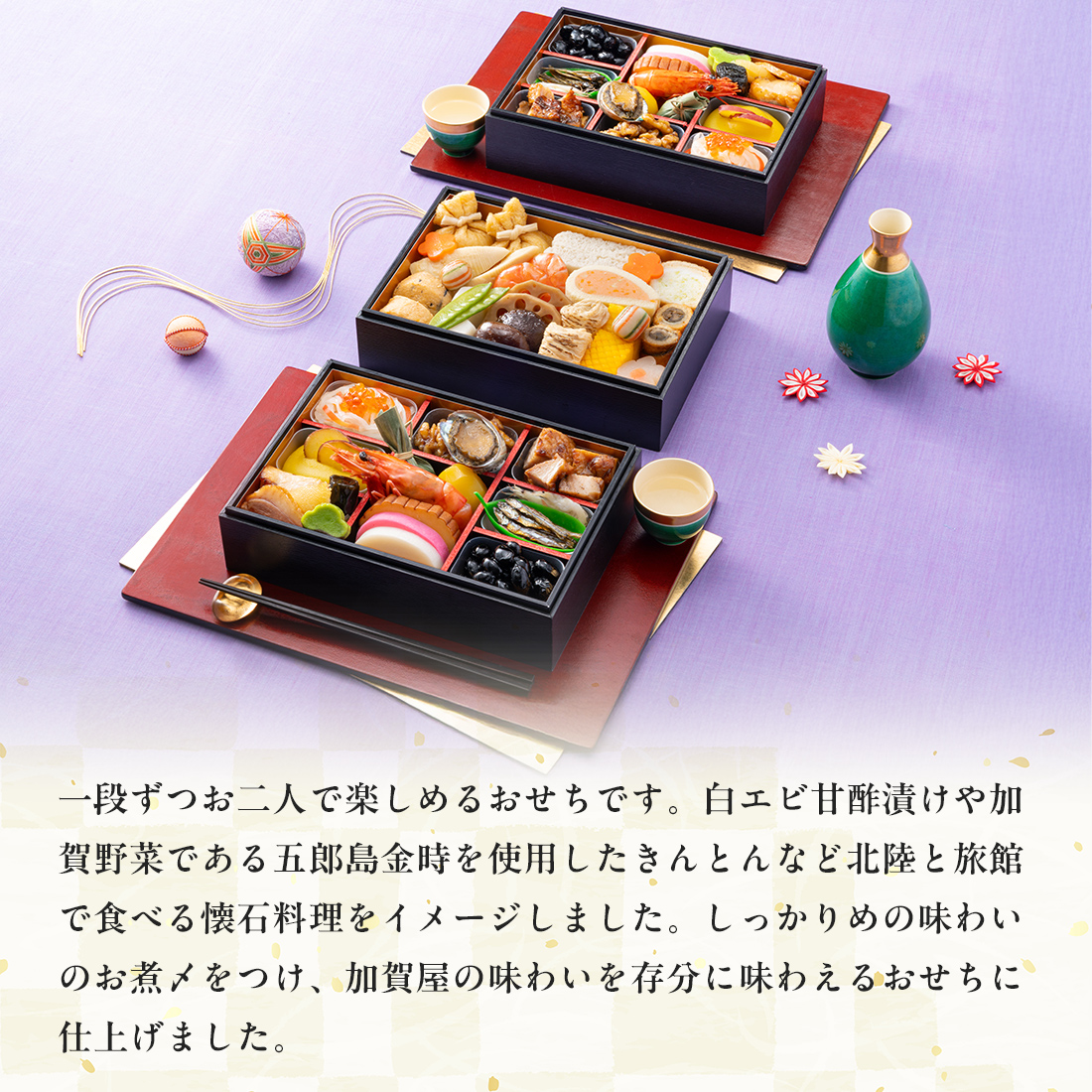 一段ずつお二人で楽しめるおせちです。白エビ甘酢漬けや加賀野菜である五郎島金時を使用したきんとんなど北陸と旅館で食べる懐石料理をイメージしました。しっかりめの味わいのお煮〆をつけ、加賀屋の味わいを存分に味わえるおせちに仕上げました。