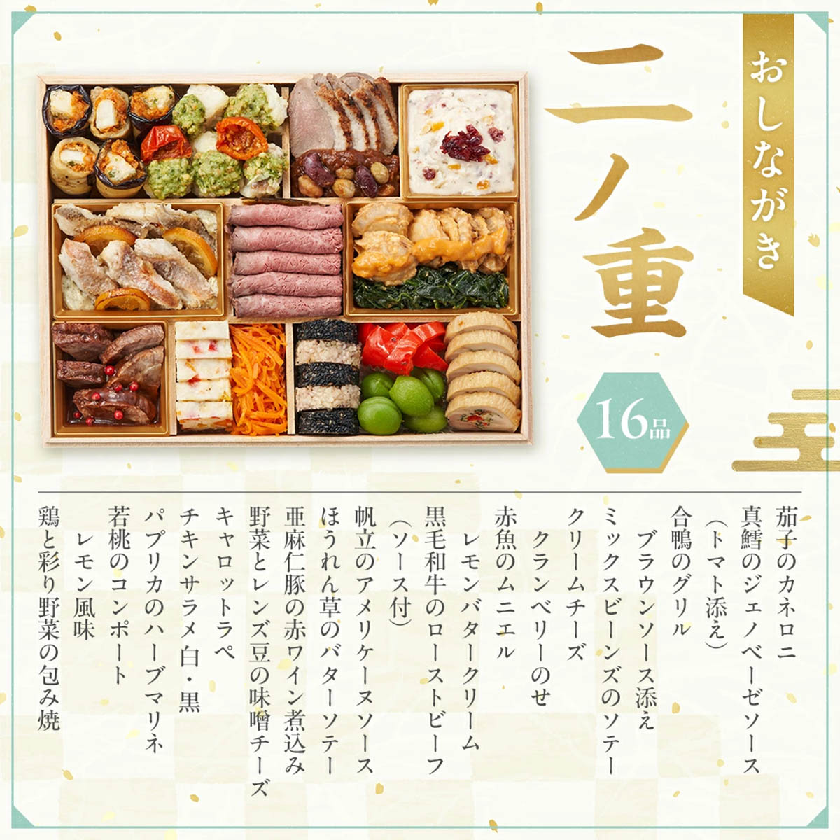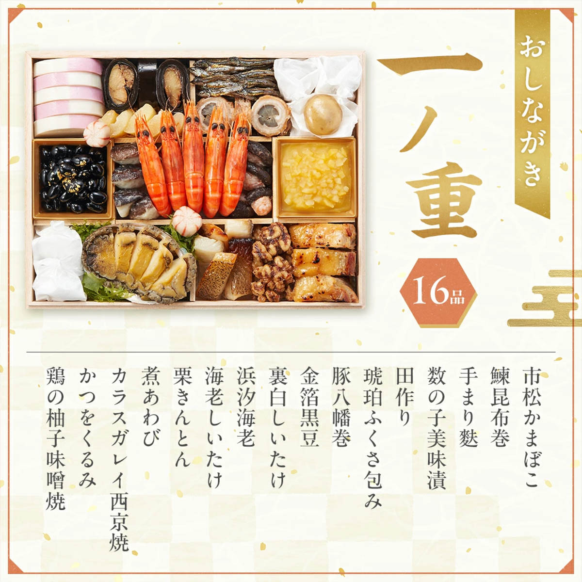 市松かまぼこ 5切、鰊昆布巻 5切、手まり麩 2個、数の子美味漬 5切、田作り 20g、琥珀ふくさ包み 5個、豚八幡巻 5切、金箔黒豆 80g、裏白しいたけ 4切、浜汐海老 5尾、海老しいたけ 4切、栗きんとん 100g、煮あわび 1杯、カラスガレイ西京焼 5切、かつをくるみ 30g、鶏の柚子味噌焼 5切