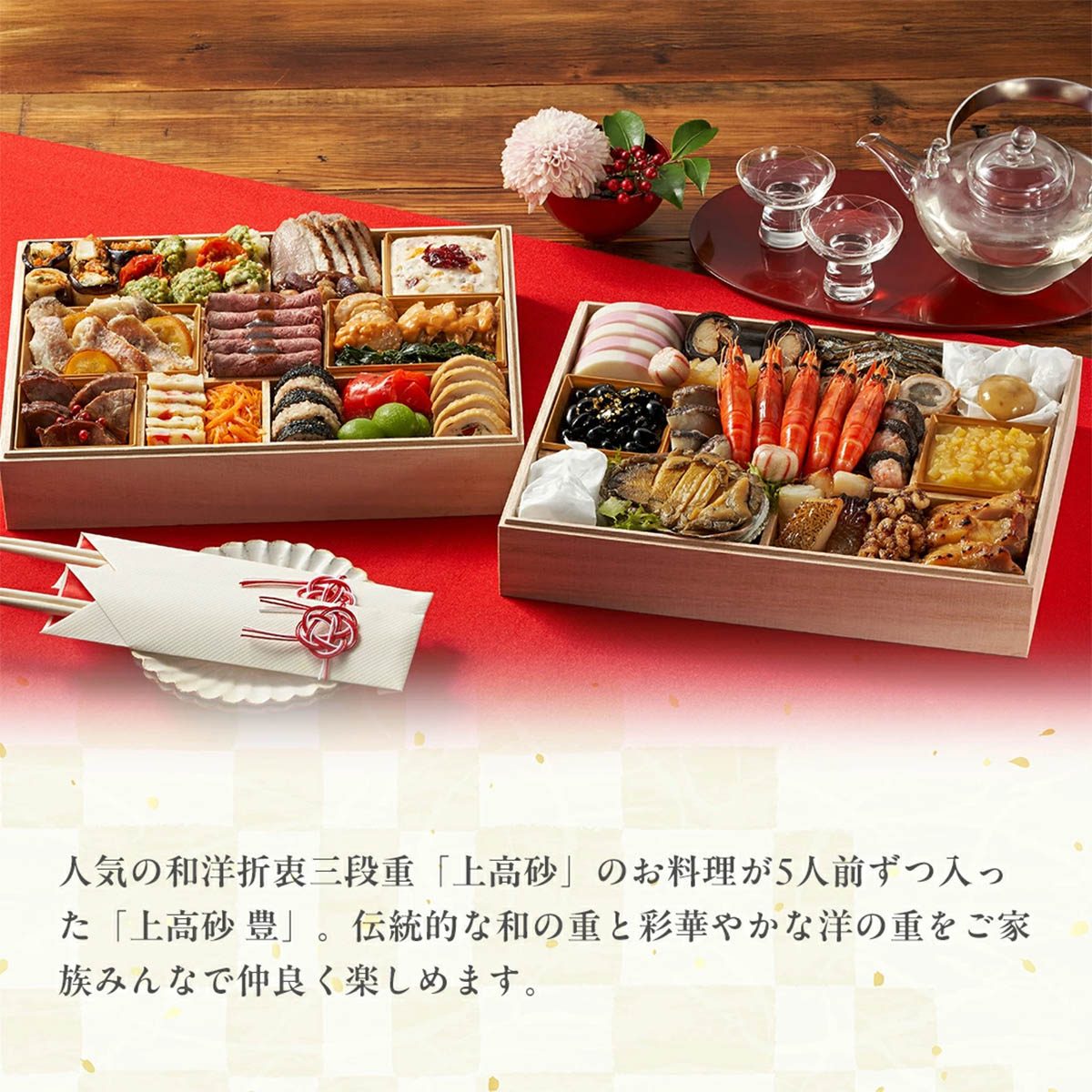 人気の和洋折衷三段重「上高砂」のお料理が5人前ずつ入った「上高砂 豊」。伝統的な和の重と彩華やかな洋の重をご家族みんなで仲良く楽しめます。