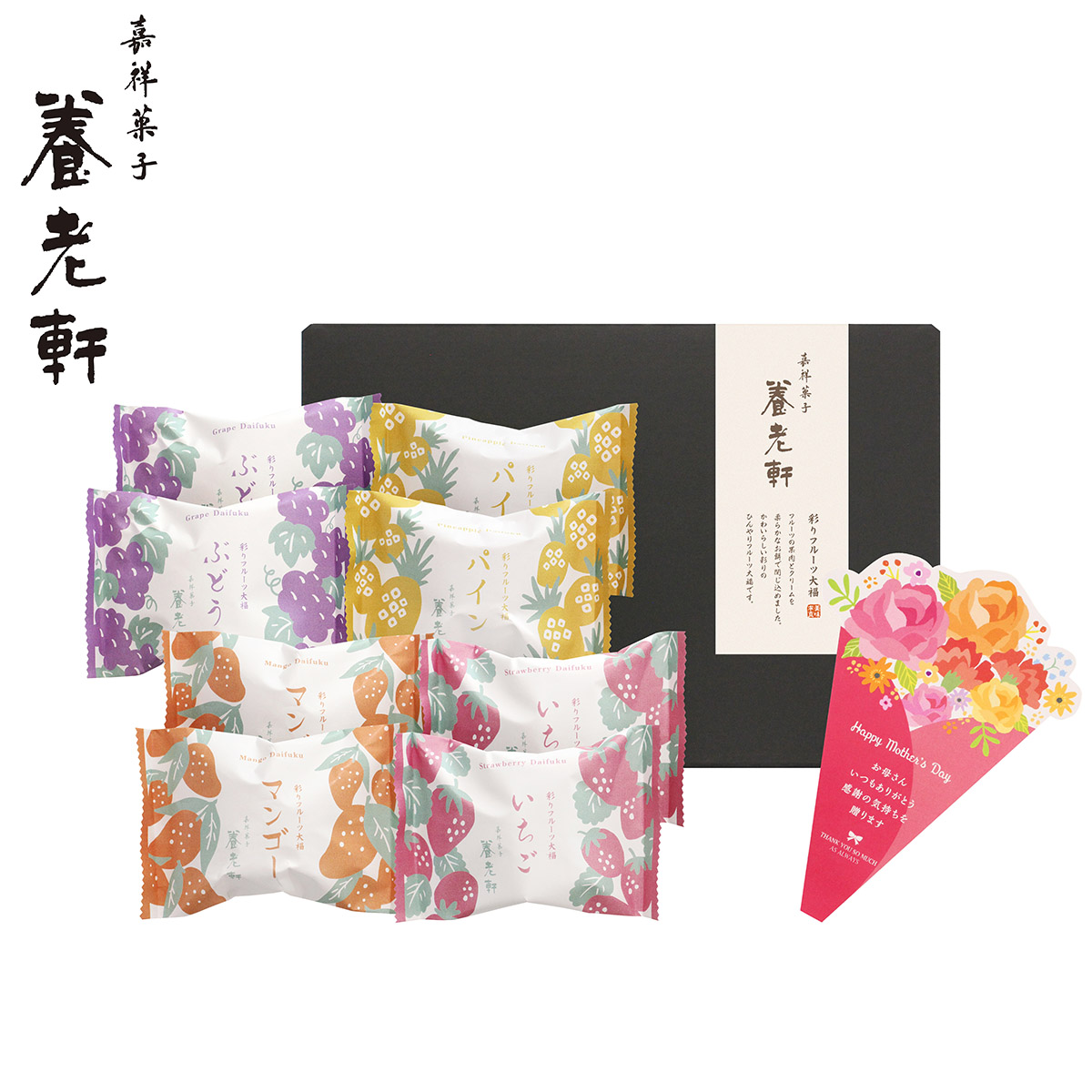 みずみずしいフルーツの果肉とクリームを柔らかなお餅で閉じ込めたカラフルなフルーツ大福です。母の日のメッセージをつけてお届けいたします。