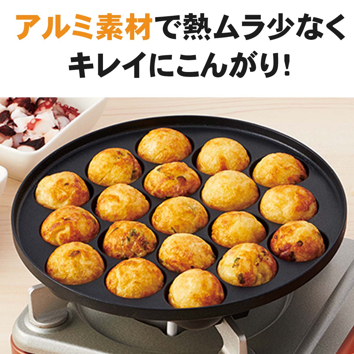 材質は熱伝導のよいアルミダイカストを使用しているので、熱ムラが少なくきれいに仕上がります。穴径は約36 mm で、一回の調理で19個の玉が作れます。