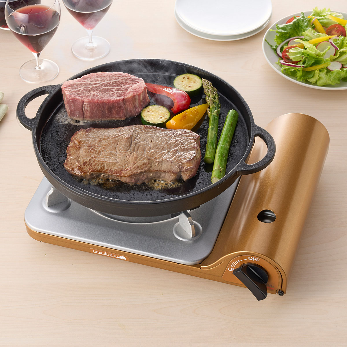 カセットフーシリーズの中でも、薄さにこだわったカセットこんろです。テーブル着席時でもお鍋の中が見やすく、具材が取り出しやすい形状です。