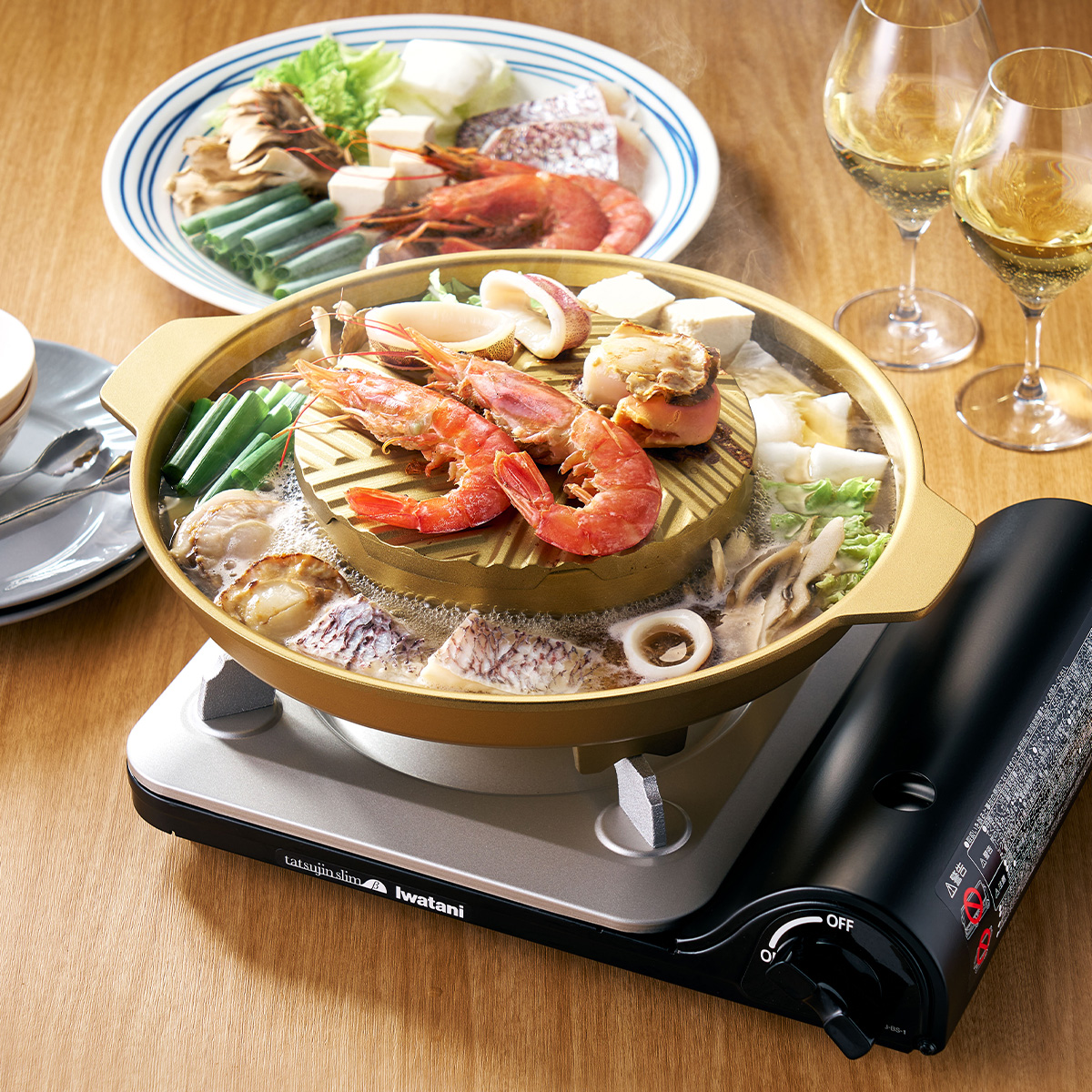 「焼き部分」で肉やシーフードなどを焼き、「鍋部分」で野菜や豆腐などをスープで煮込むと内側で焼かれた肉やシーフードの旨味が、鍋部分に流れ込み、旨味いっぱいの鍋を楽しむことができます!